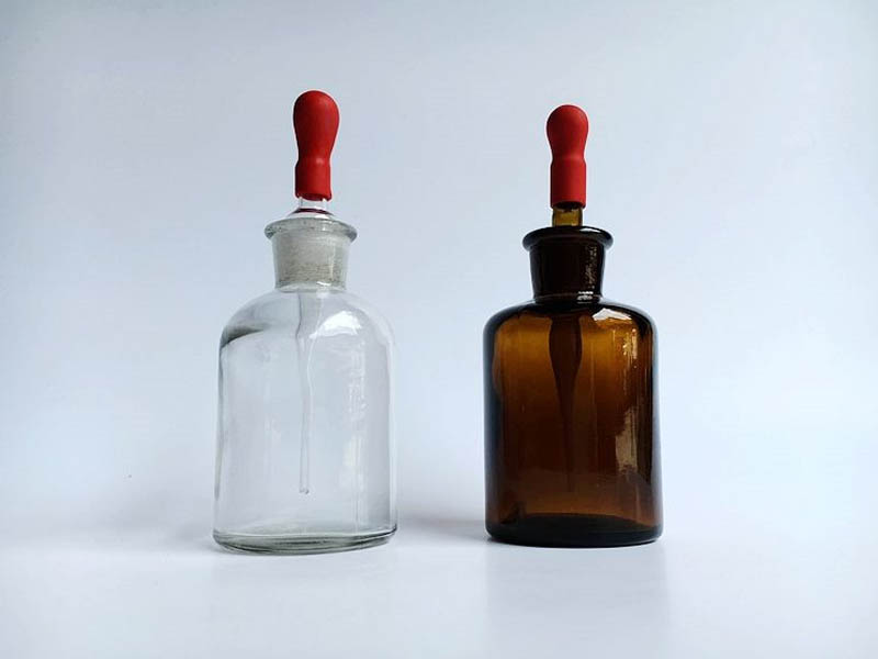 滴瓶用于存放少量液體。需要避光保存時用棕色瓶。滴瓶瓶口內側磨砂,與細口瓶類似,瓶蓋部分用滴管取代。
